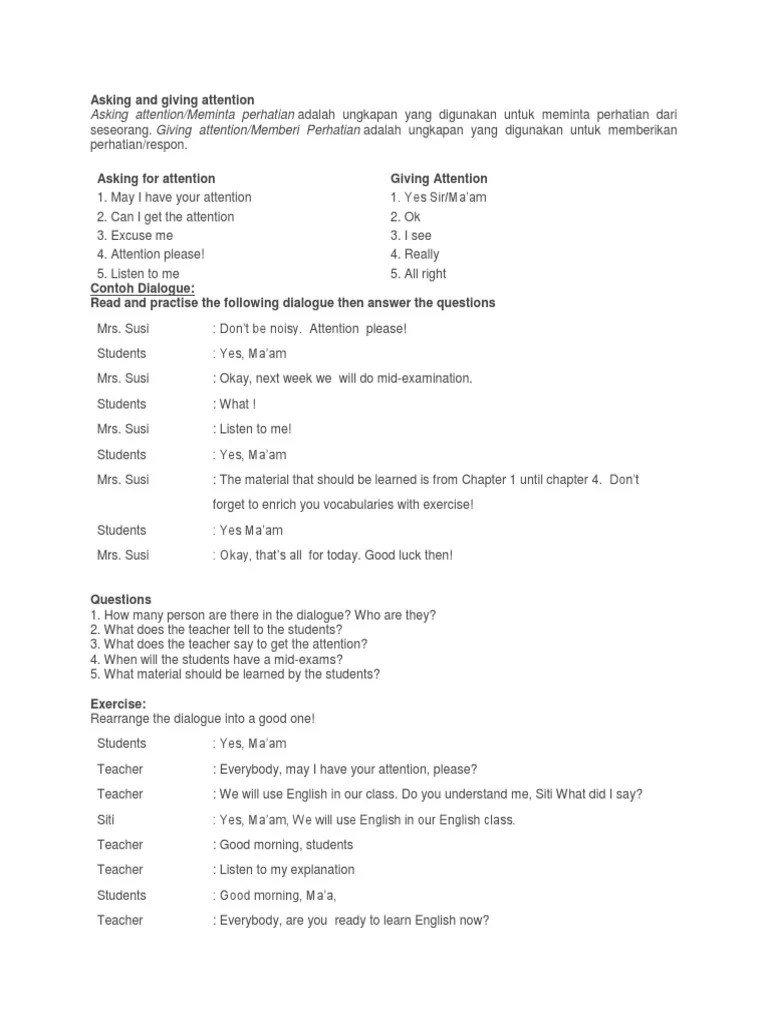 Tolong dijawab ya soalnya ini pr buat besok, thanks :) 1. Asking attention/meminta perhatian adalah ungkapan yang digunakan untuk . Contoh percakapan asking and giving attention atau meminta perhatian dari adegan film traducir a español aprenda inglés con libros, películas y podcasts. , look at this board. Pay attention and completely three dialogis with expresing.